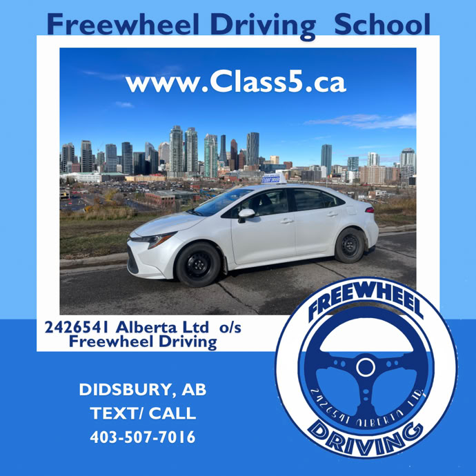 2426541 Alberta Ltd o/a Freewheel Driving has school cars with dual brakes and instructor mirror. Driving instructors hold an instructor licence issued by the Government of Alberta.